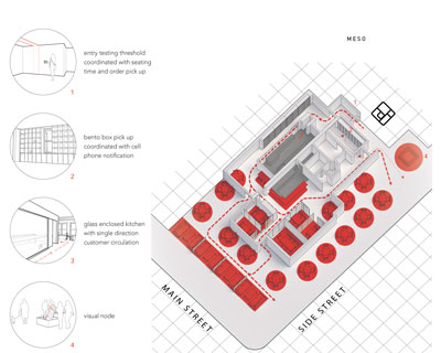 • Meso – For individuals wanting the in-restaurant experience, we have reimagined how the space looks and functions while adhering to CDC and local guidelines all within 6 FT safe spacing. Technology, such as reserving space, scanning patrons upon entrance, air filtration, translucent screens, antimicrobial surfaces, and automated doors, will be integrated.