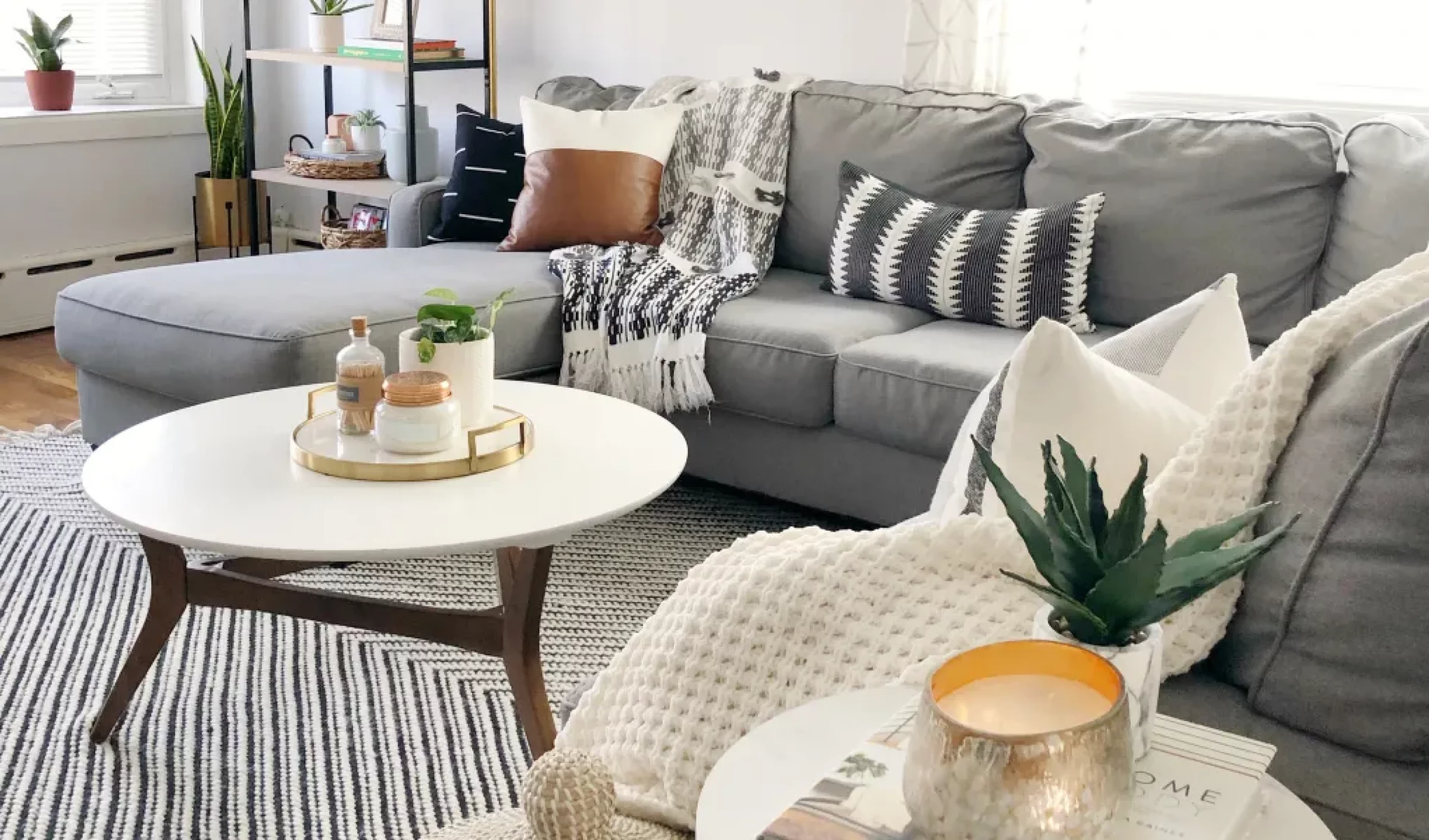 One of the most stylish sofa ideas for small living rooms is adding rounded accent pieces to counteract the straight lines of the top furniture. Take note of how the roundness of the coffee table, wooden side table, and floor lamp harmoniously contrast with the straight lines of the sofa.