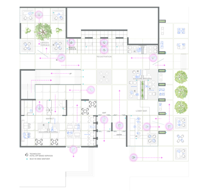 Emerging from a global pandemic, the hotel of tomorrow sets a new stage for the modern traveler, rethinking the way they discover, interact with, and move throughout the space. Bringing the 6X6 foot socially-distant metric directly into the aesthetic of the design, The Refined Module enables a sense of well-being and connection through the context of building materials. Guests subconsciously perceive the flow of the space through visual queueing in the floors and ceilings, contemporary material palettes and lighting. The Refined Module eliminates temporary applications of distancing measures as the future unfolds, instead providing long-term design integrity by breathing new life into existing materials that can be applied to brand standards across all levels of hotels.